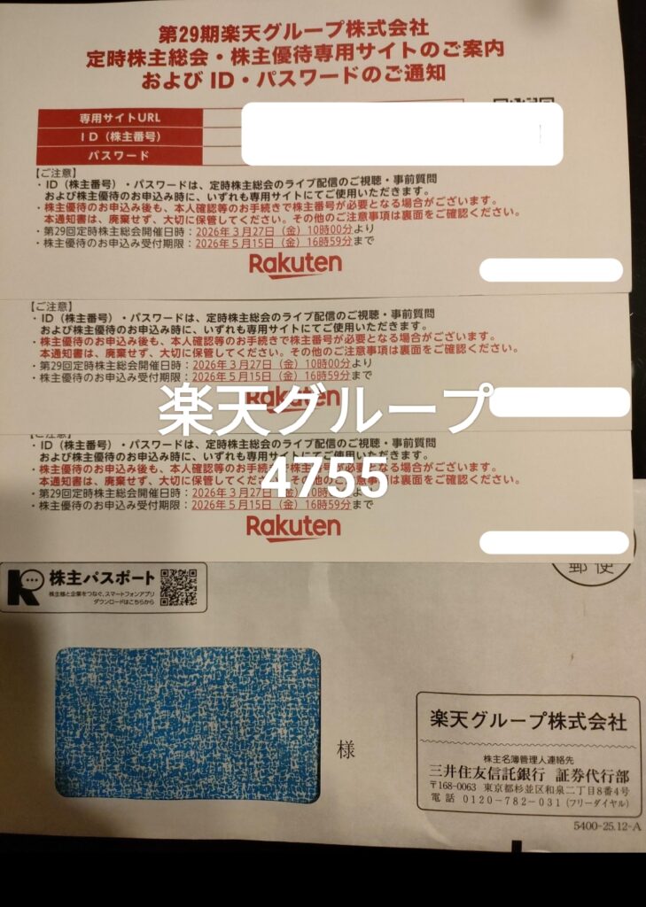 楽天グループ(4755)の株主優待が今年も無事に到着しました。今回は3名義分。私は今回、SBI証券の一般信用を使ってクロス取得しました。 いつ届く? 2026年3月13日普通郵便で到着しました。権利確定から3か月弱で届くようです。 優待の基本情報 権利確定... -