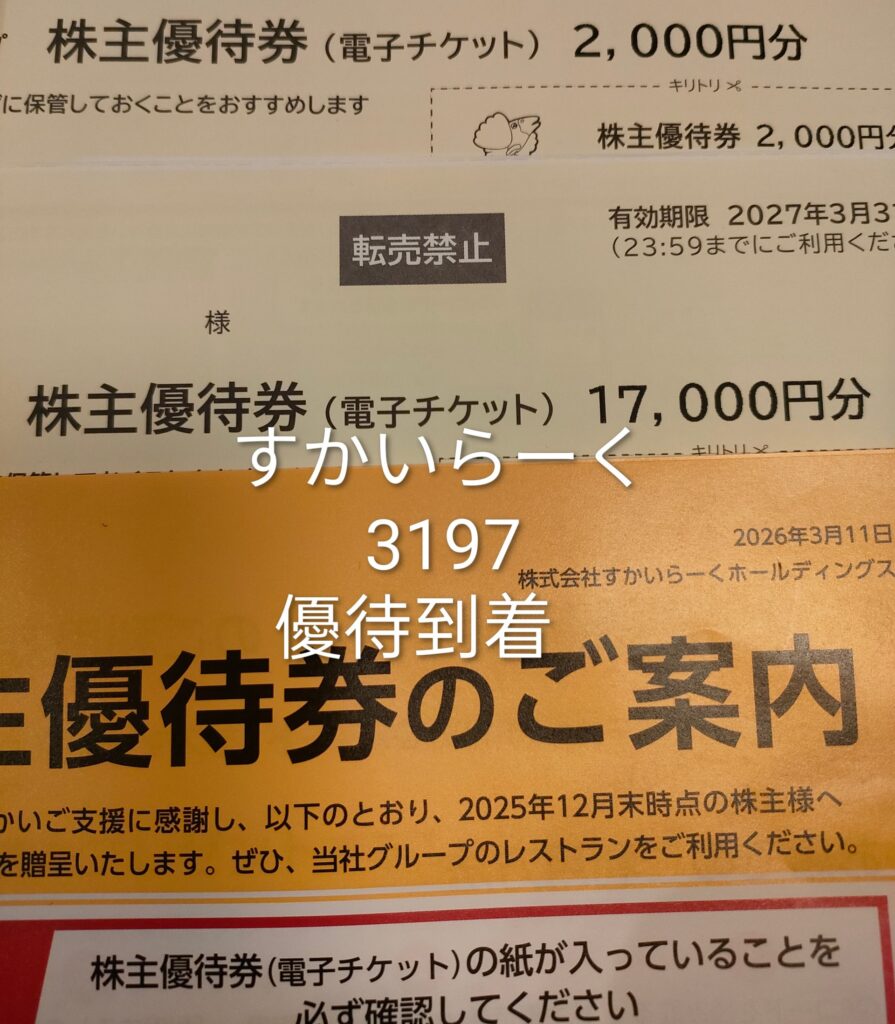すかいらーく(3197)の株主優待が2026年3月に到着しました。 今回は3名義分で 合計36,000円分の食事優待券(電子チケット) を受け取りました。ガスト・バーミヤン・ジョナサン・しゃぶ葉など幅広い店舗で使える、外食系の中でも特に人気の高い優待です。... -