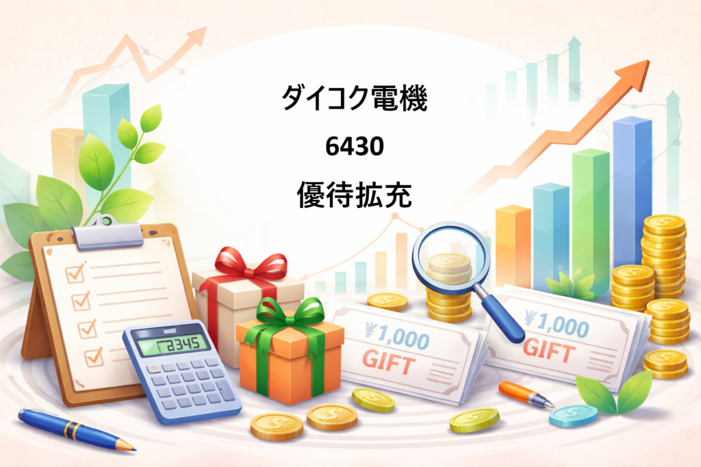ダイコク電機(6430)は株主優待制度を拡充し、優待区分を見直しました。保有株数に応じた優待内容が改善され、長期保有にもメリットがある内容です。 27年3月末から優待品をQUOカード→デジタルギフトに変更し、保有株数と保有期間に応じて1000~6000円相... -