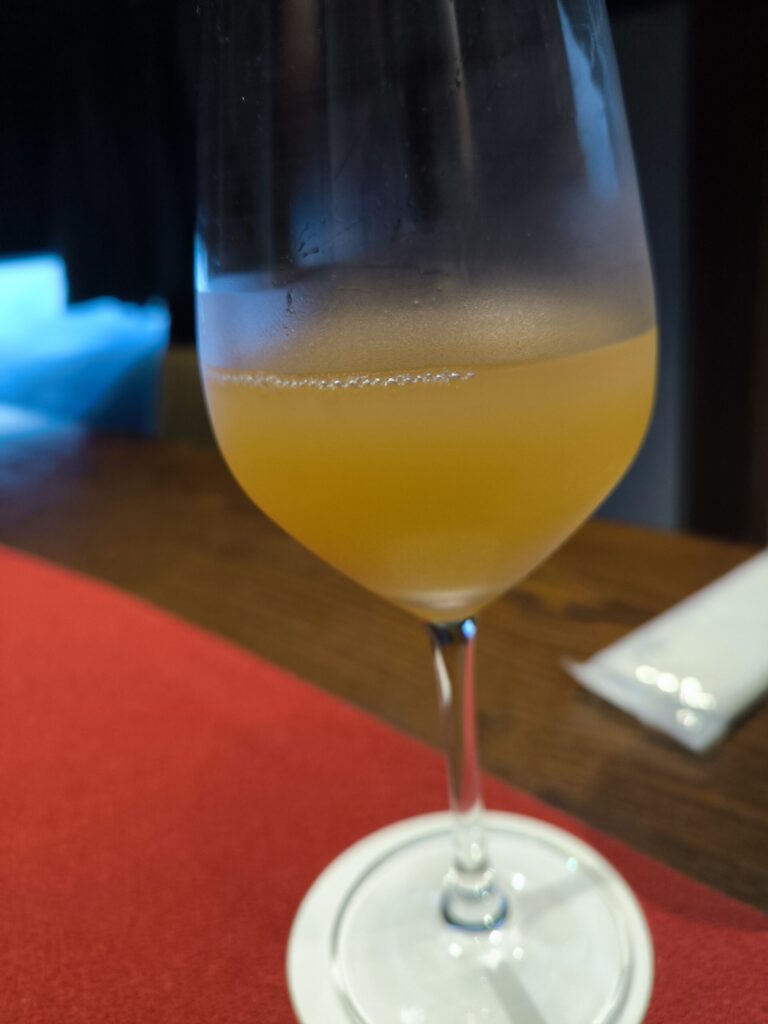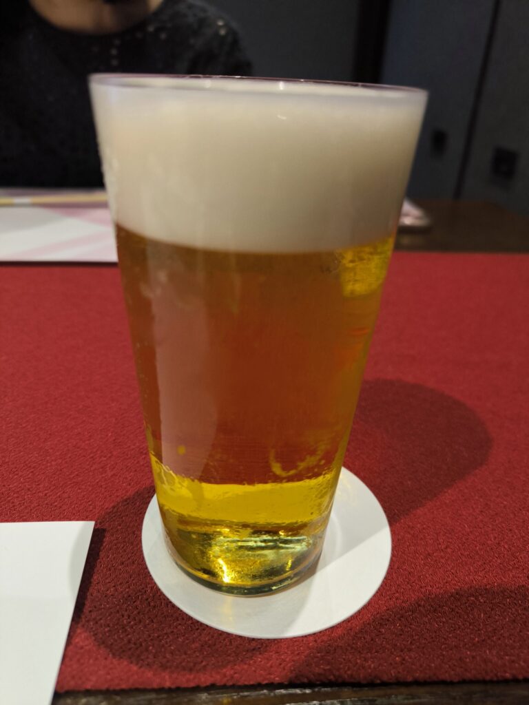 夫はビール、私は桃100%ジュースで乾杯。よいグラスで美味しいです。