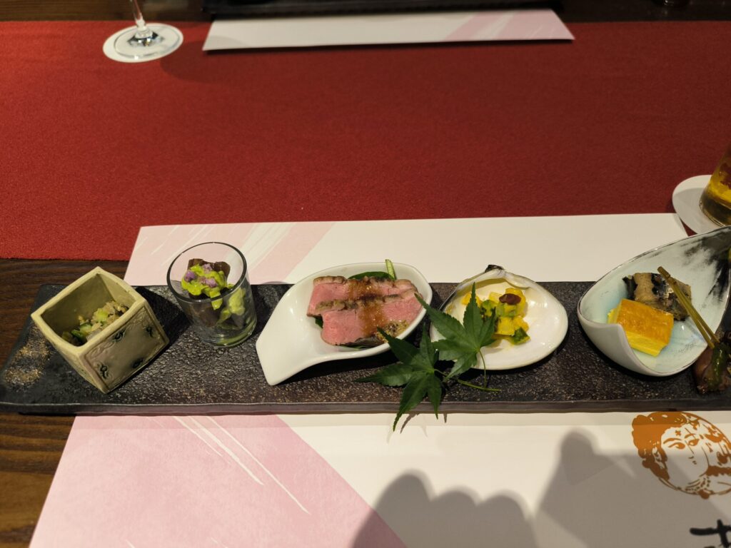 右から「ホタルイカ、鰯、チーズのカステラ?」「アスパラ」「鴨(ローストビーフみたい)」「マグロとアボカド」「アサツキの胡麻和え?」丁寧に説明してくれましたが、ちょっと自信ないです。すいません。