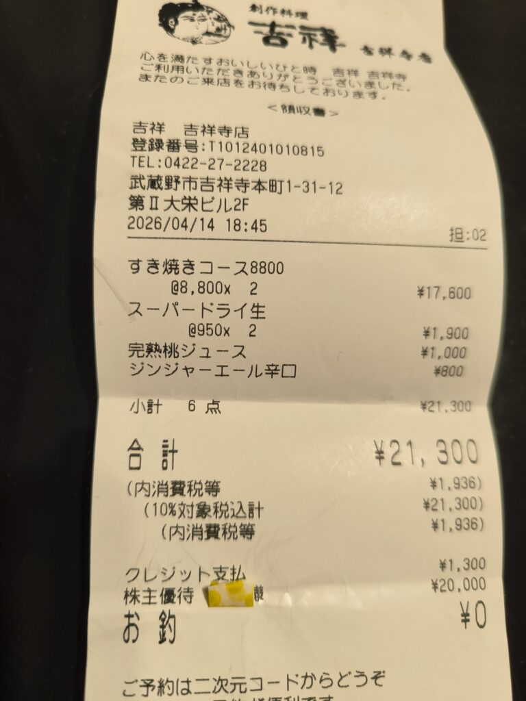 - 吉祥寺の「吉祥」は高級和食・会食向けで、自宅が近ければ優待消化に最適