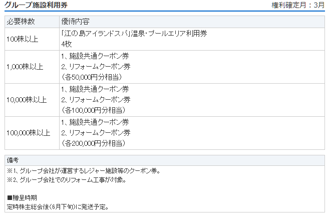 配当金は一株100円、利回りは4%超え+株主優待なので、良しです。母体の経営も安定していますので、そこは安心かと思います。