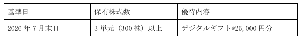 - 対象:基準日(2026年7月末)に300株(3単元)以上を保有する株主