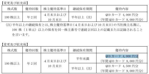 特に、2026年10月基準日からは、100株保有で年間 9,000円分のQUOカードが受け取れるようになり、個人投資家にとって魅力が大きくなるアップデートとなっています。