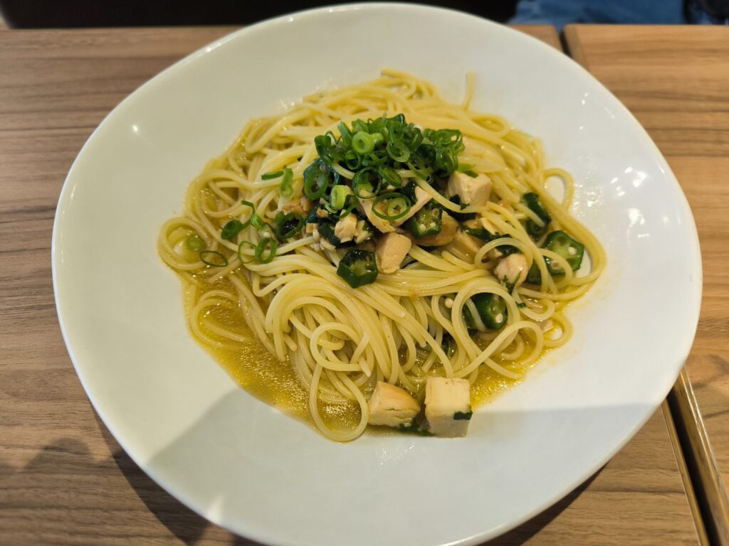 一口目は味が薄いと感じましたが、食べ進めるうちに、「こんなものか」と思いました。和風でにんにくが香って、味付けは控えめで全体的に軽い印象。鶏肉とおくらの組み合わせで、さっぱり食べられる日替わりパスタでした。