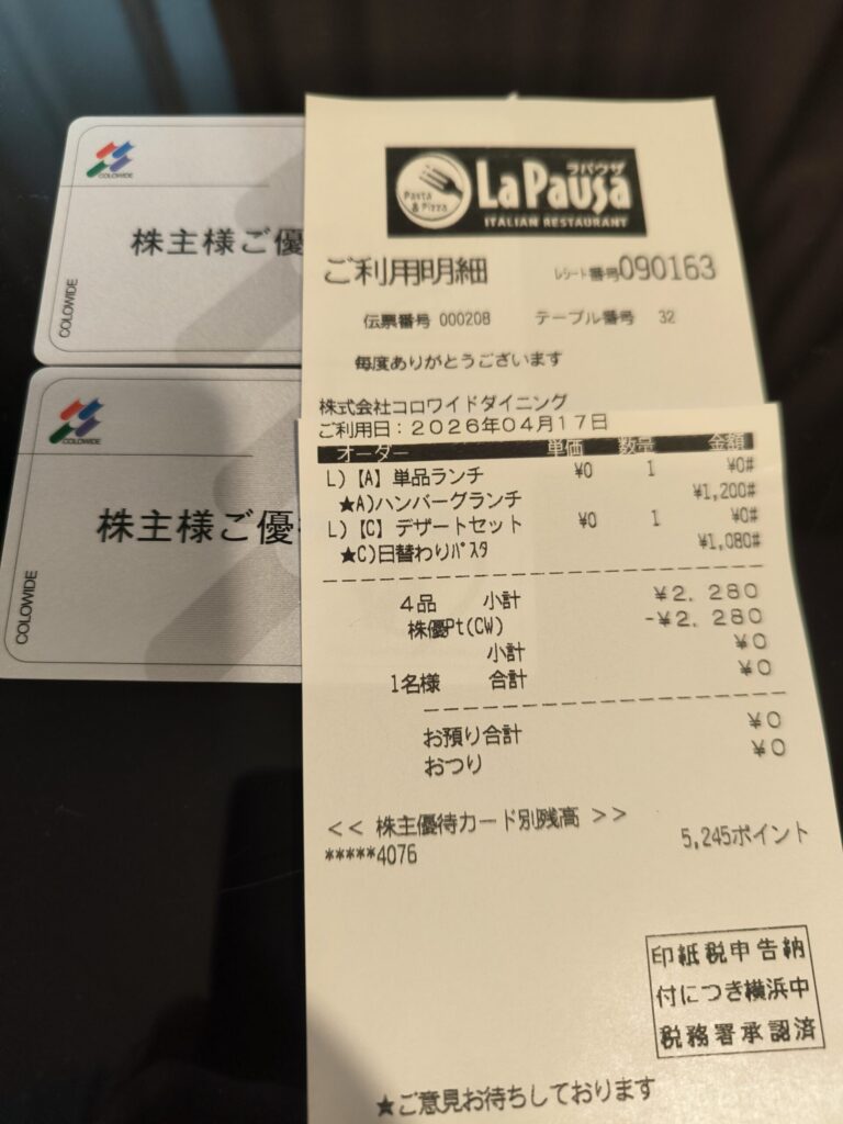 「コロワイド優待の使い道を知りたい」「ラパウザのランチはどんな感じ?」という方の参考になれば幸いです。