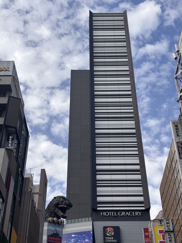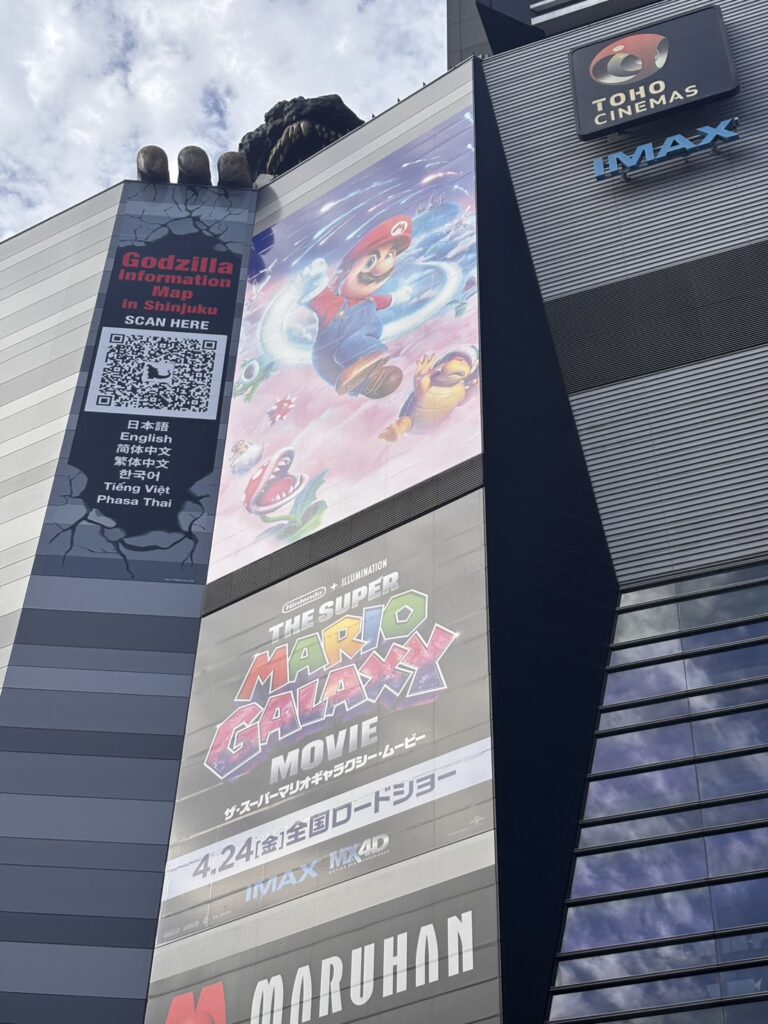 ゴジラがお出迎え。マリオの看板も。この並びはゴジラがクッパに見える笑 写真を撮っている外国の人が多いです。
