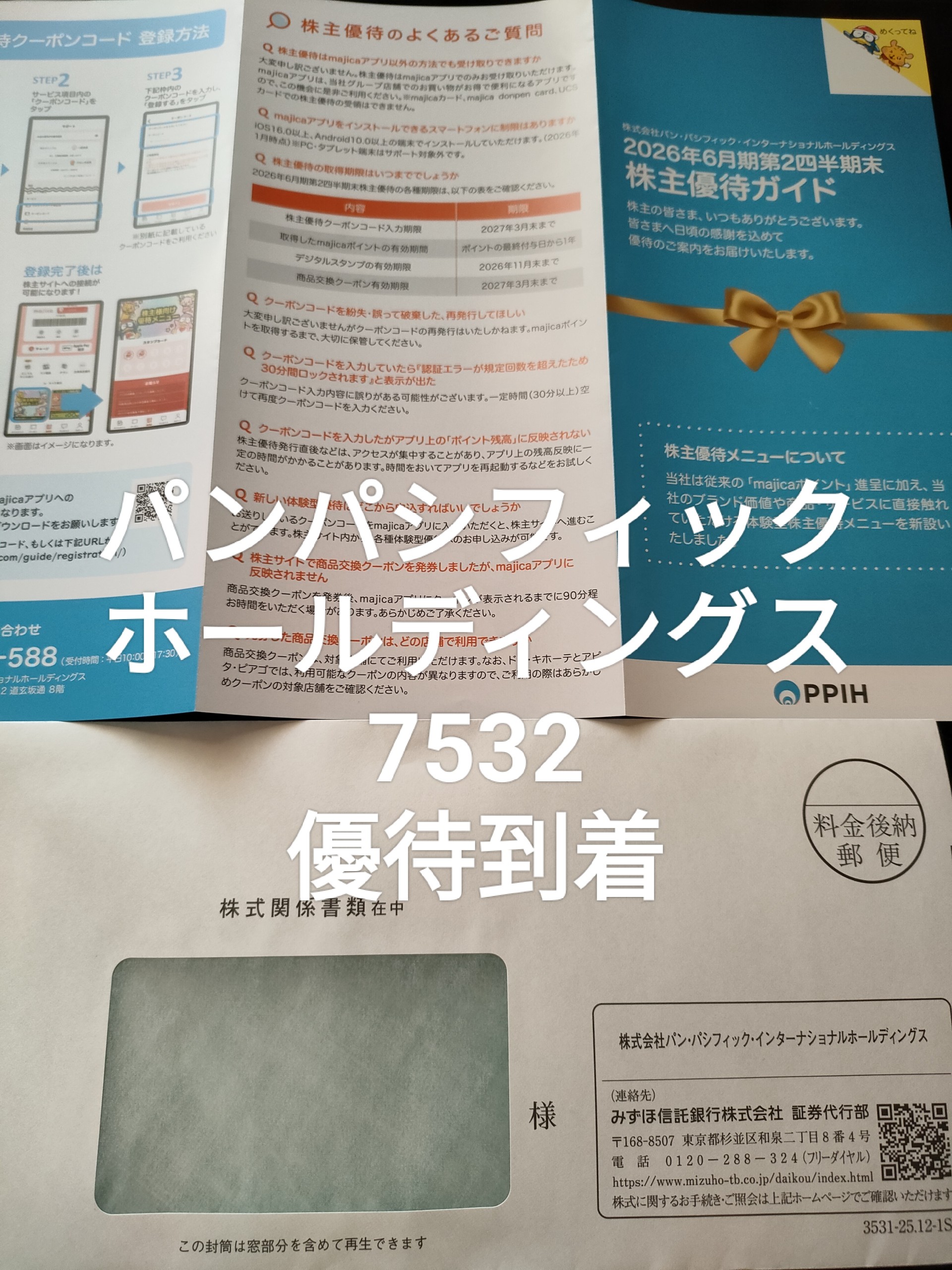 通称「ドンキ」で有名なパンパシフィックインターナショナルHD(7532)株主優待が今年も無事に到着しました。私は今回、SBI証券の一般信用を使ってクロス取得しました。