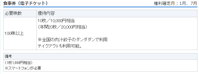 株主優待は、 100株以上で年間2万円分(1万円×年2回)の電子食事券がもらえます!