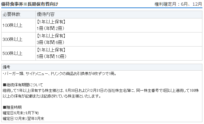 みんな大好きな日本マクドナルドの株主優待は、 100株以上で「優待食事券(6枚綴り)」が年2回もらえる制度です。