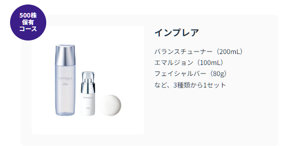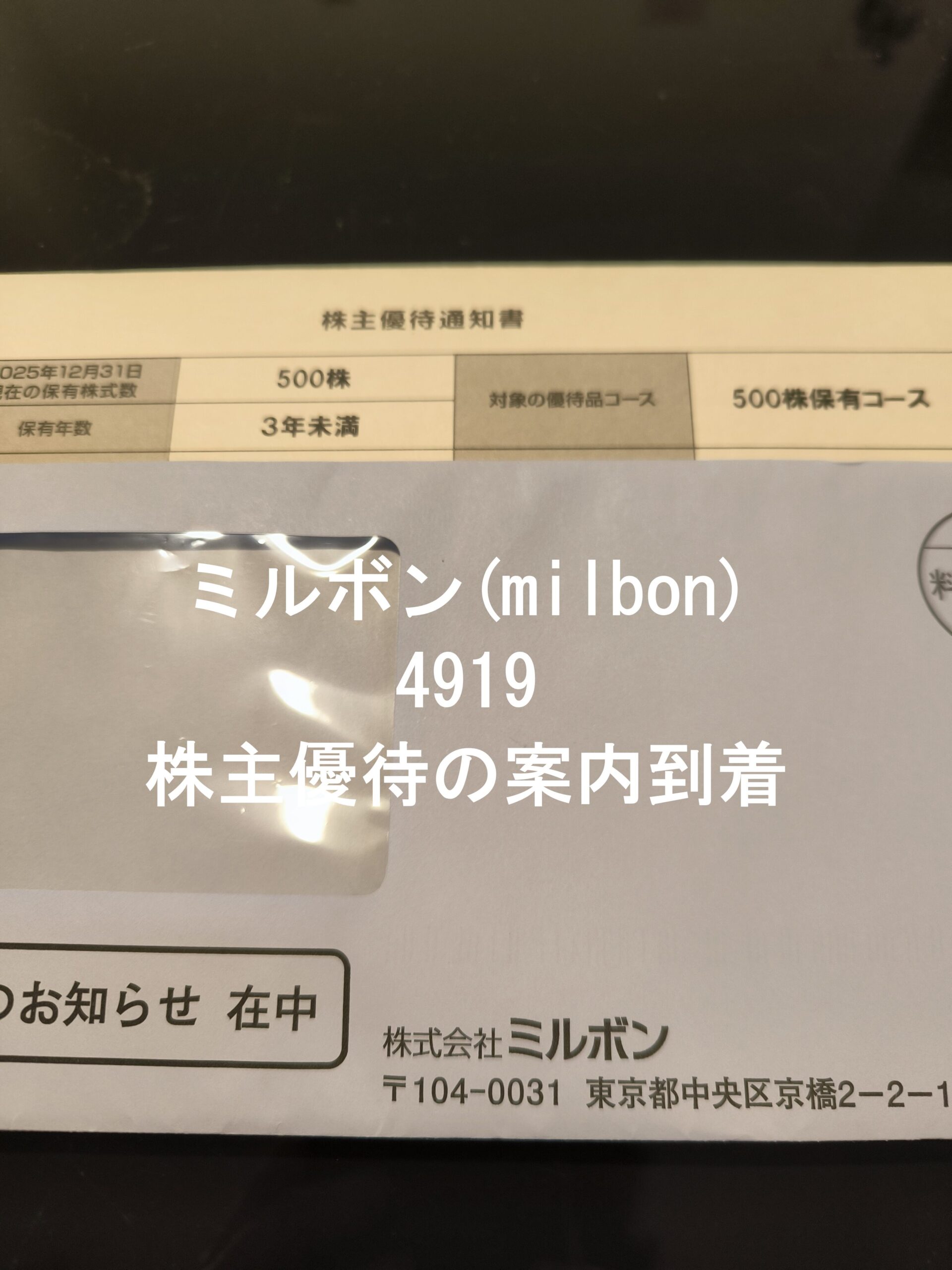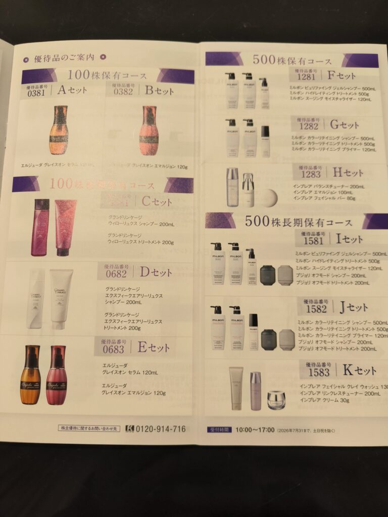 ミルボン(4919)から、株主優待の選択案内(100株/300株/500株コース)が届きました。 毎年人気の「インプレア」シリーズを中心に、エルジューダ、グランドリンゲージなど保有株数と保有期間に応じて内容が変わります。